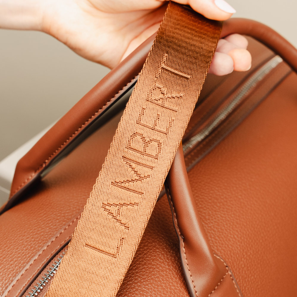 Made with recycled materials and vegan leather, the Mae travel bag is designed to care for your essentials and the planet.